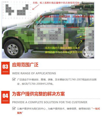 多年經驗偽裝波段范圍:可見光(380nm~760nm)和近紅外(760nm~1200nm); 外墻迷彩漆不是水漆。盡管水漆是一種環保型的涂料,;